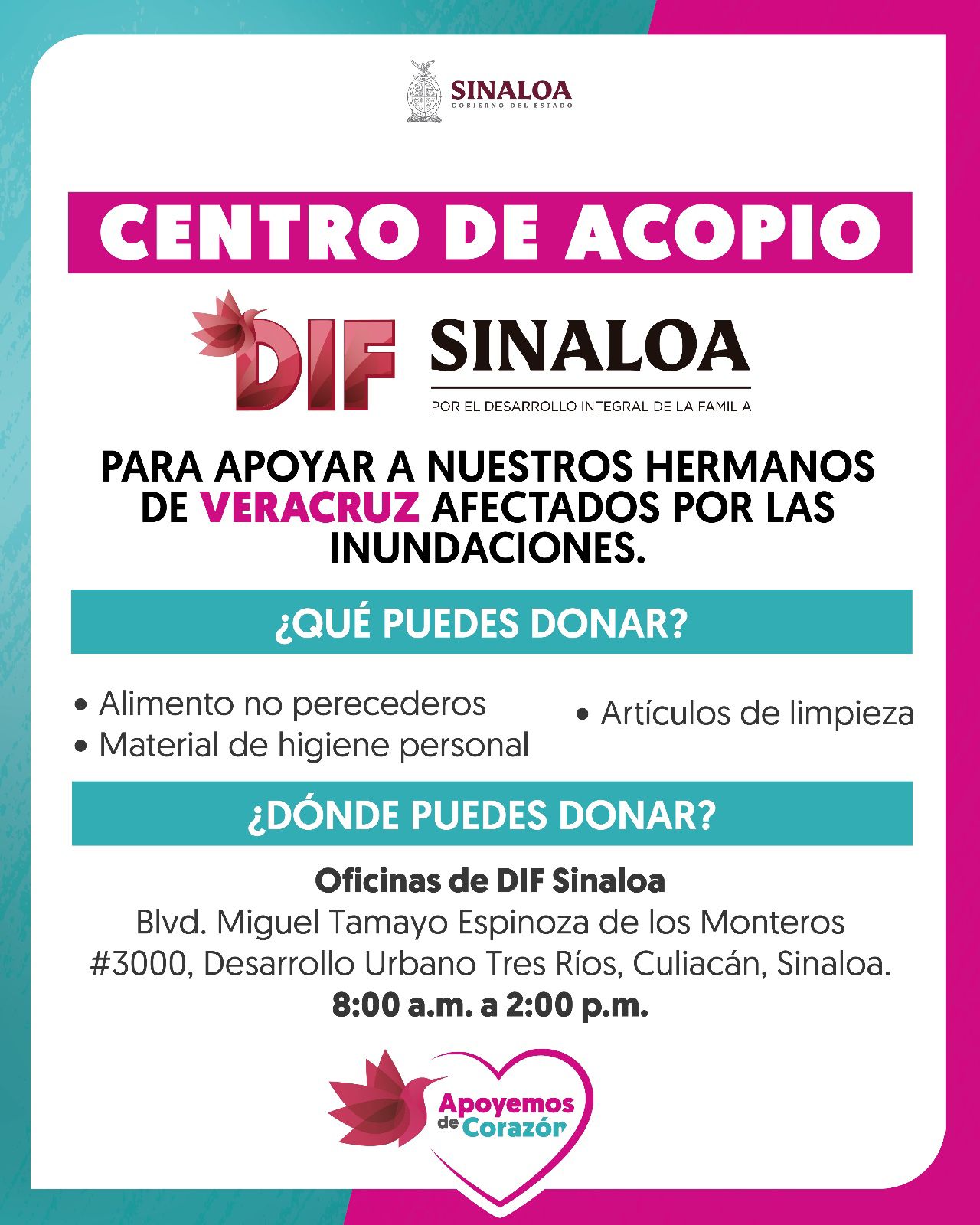 “Apoyemos de corazón. Hoy por ellos, mañana por nosotros”, es el mensaje con el que el organismo estatal invita a los sinaloenses a sumarse a esta campaña de ayuda humanitaria.