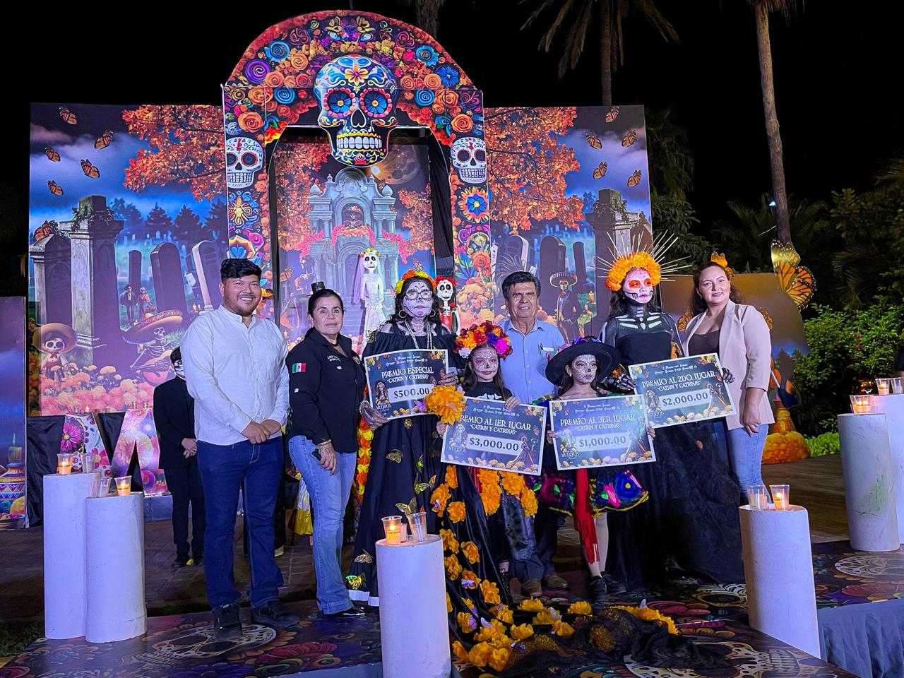 Por la tarde, la Plazuela Miguel Hidalgo se convirtió en el escenario principal del concurso de catrinas y catrines, enmarcado por una ambientación alusiva a un panteón tradicional. La iluminación y las letras turísticas dieron realce a una pasarela que combinó elegancia, tradición y creatividad.