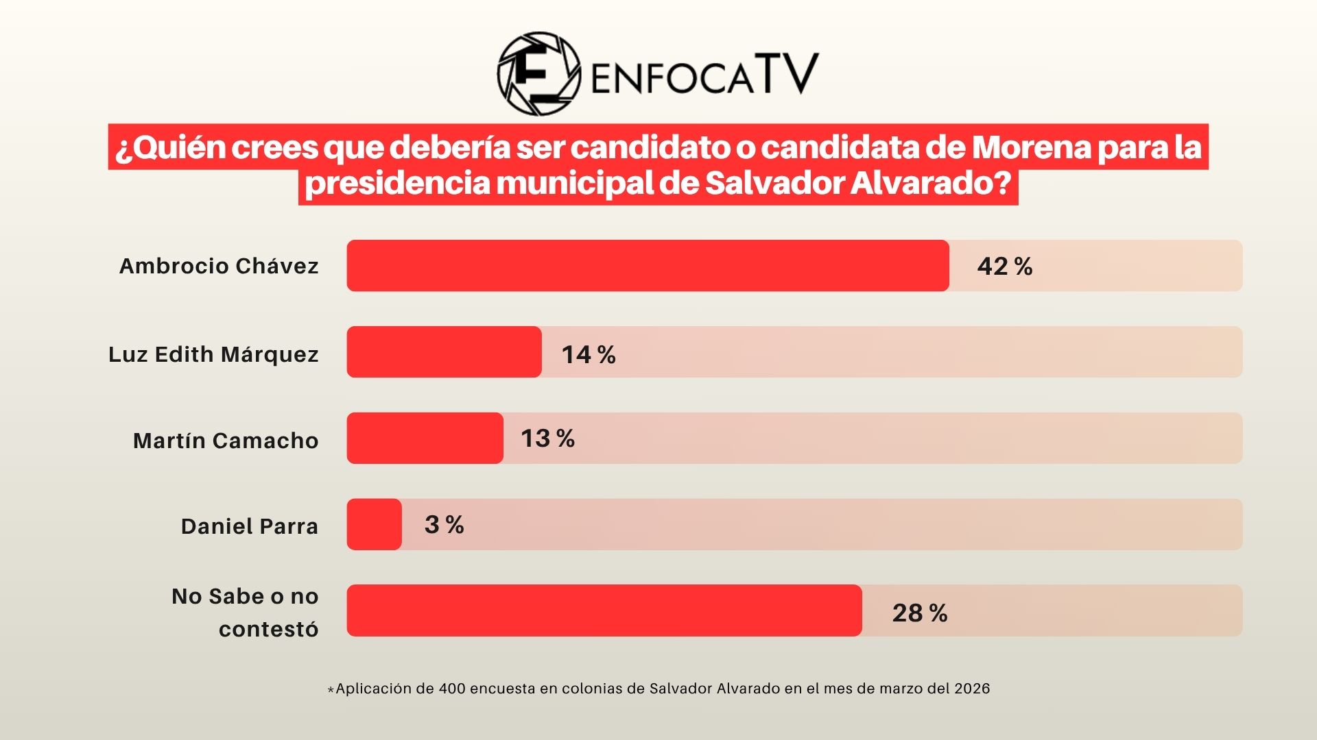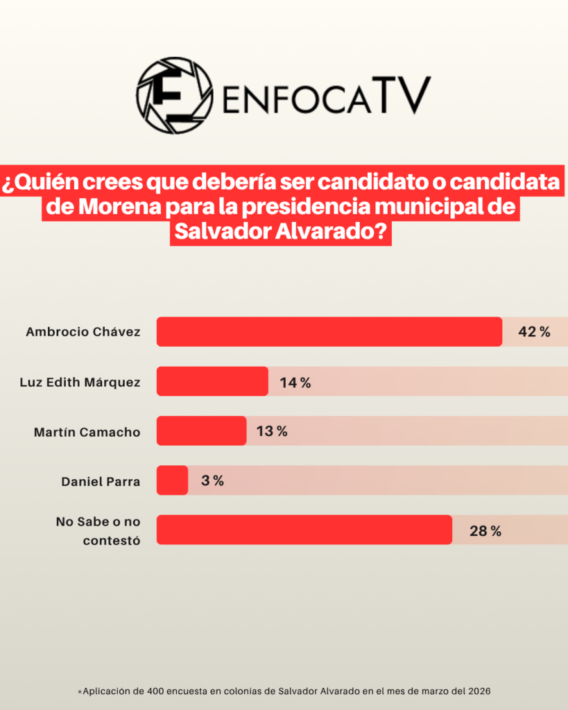 Fueron 400 encuestas aplicados donde se les preguntaba “¿Quién crees que debería ser candidato o candidata de Morena para la presidencia municipal de Salvador Alvarado?”.